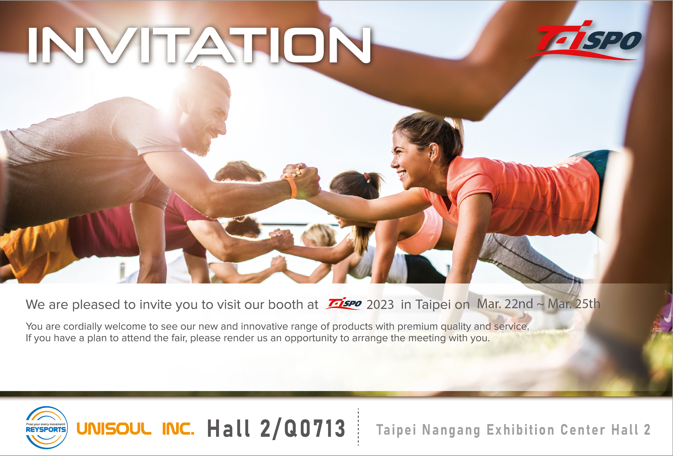 We are pleased to invite you to visit our booth at TaiSPO 2023 in Taipei on Mar. 22nd ~ Mar. 25th. You are cordially welcome to see our new and innovative range of products with premium quality and service. If you have a plan to attend the fair, please render us an opportunity to arrange the meeting with you.