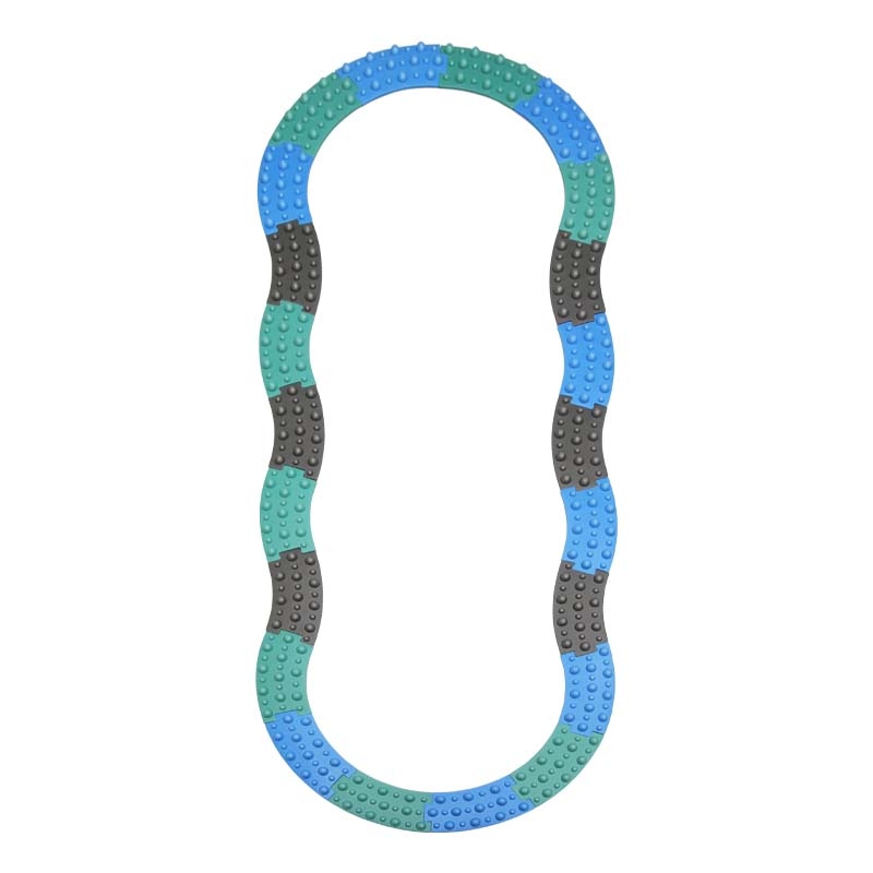 This set includes 22 interlocking tiles that form a curvy path with an inner length of 200 cm and an outer length of 224 cm. Each tile measures 27.5 x 13.4 x 1.8 cm, featuring raised textures that stimulate children’s feet, promoting tactile exploration, motor skill development, and concentration. Available in three color variations, the path enhances both visual appeal and sensory engagement.