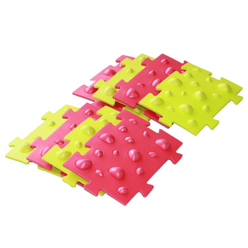Each set includes 8 interlocking tiles (26.2 x 18.7 cm), which can be easily assembled into various shapes and layouts depending on space and training needs. The raised tactile bumps stimulate children’s feet, enhancing balance, coordination, and sensory exploration. With two standard colors in each set, the tiles provide visual variation and playful appeal.